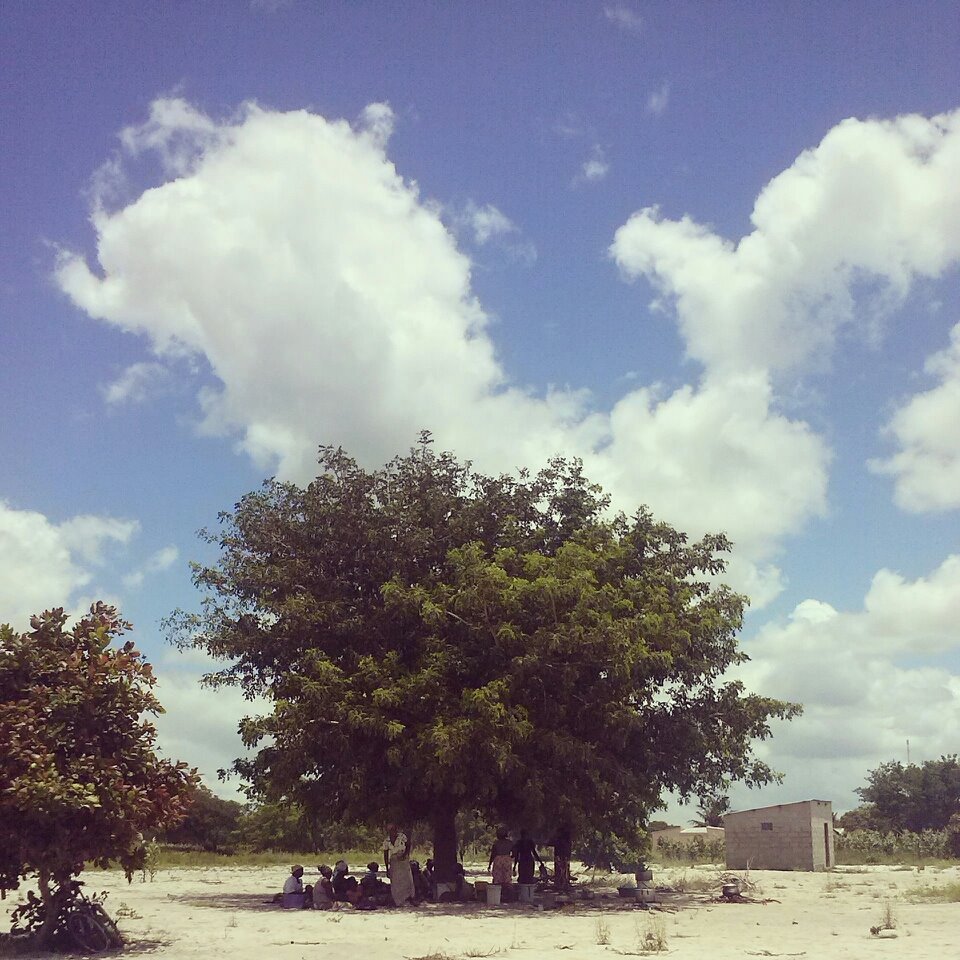 Se sale de la ciudad por la ruta y a medida que se avanza van perdiendo frecuencia las vendedoras de la calle y se van desdibujando los límites de las propiedades. Ya no se distingue que es de uno y que del otro, solo son grandes solares. Inmensos areneros desérticos sobre los que se emplazan construcciones, casas o edificios públicos se arman alrededor de los arboles, o de él árbol. La casa, la escuela, no es una construcción sino varias, serán los cuartos, el baño, la cocina que en general no son más que chapas que dan reparo para hacer un fuego, el gallinero, la conejera, más lejos la mashamba (la huerta). En la escuela las aulas, la sala de dirección, el baño y así. Ya no importa si se está adentro o afuera, afuera es igual que estar adentro. El árbol es el refugio y la reunión, lo que alguna vez fue fogata o chimenea, lo que hoy es un televisor. Y cuando se reúne la comunidad, el árbol es la plaza del pueblo, un centro político. Hace demasiado calor y no hay luz eléctrica; el espacio de reunión, el lugar donde pasa la vida, el elemento que ordena la casa, es el árbol. Bajo el árbol se come, se charla, se canta, se duerme la siesta, se hace el fuego para preparar la comida, se reciben las visitas, se ve al médico. No voy a decir nada nuevo diciendo que no hay mejor sombra que la del árbol, mejor que cualquier galería. Los techos se calientan y las paredes cortan el aire que corre, pero bajo un árbol corre viento entre las hojas y baja la temperatura, y no importa cuán insoportable sea el calor, el árbol hace que se olvide rápidamente. Pero hay que estar atentos, las horas pasan y hay que acomodarse al movimiento de la sombra. Lo que comienza bien temprano en un lugar para la tarde estará pasando a 20 o 30 metros de donde empezó. Así como la vieja Úrsula en Cien años de soledad descubre cuando queda ciega que existen diferentes estaciones del año porque percibe como se modifican entre el invierno y en verano las sombras y las posiciones rutinarias de su familia, donde escasea la sombra el giro de la tierra y el paso de las horas importan y mucho.